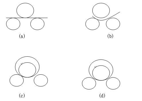 該機(jī)結(jié)構(gòu)形式為三輥對(duì)稱式。上輥在兩下輥中間對(duì)稱位置作垂直升降運(yùn)動(dòng),通過(guò)蝸輪、蝸桿而獲得,兩下輥?zhàn)餍D(zhuǎn)運(yùn)動(dòng),通過(guò)減速機(jī)的輸出齒輪與下輥齒輪嚙合,實(shí)現(xiàn)板材的行走。當(dāng)上輥的下壓力超過(guò)材料的屈服限度時(shí),便使所卷制的材料變形,變形過(guò)程如下圖: